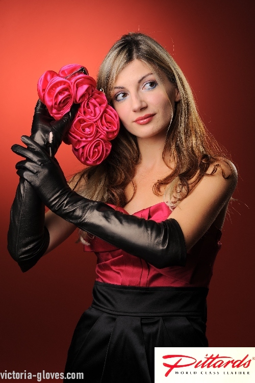 Black Glamorous Long Leather Opera Gloves with a little stylish accent on the wrist, rich black color, perfect for fall/spring season, evening outs, opera and party events.